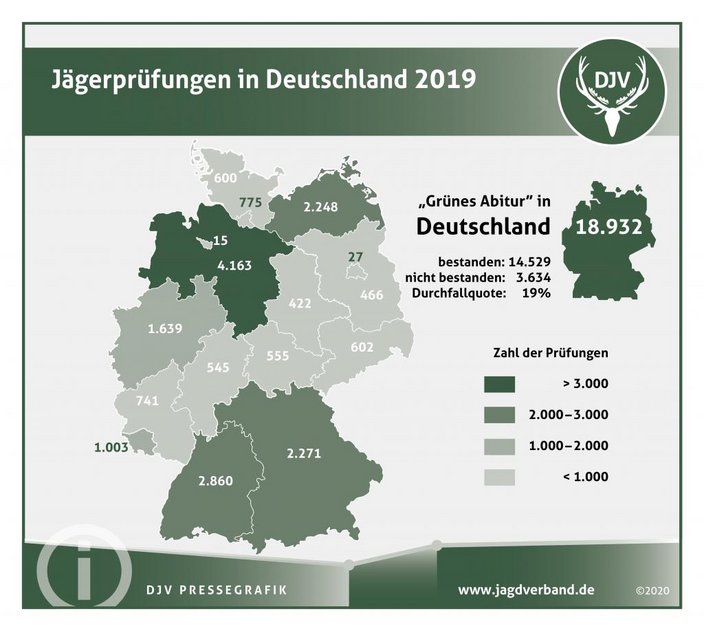 Insgesamt über 18.900 Frauen und Männer haben sich 2019 an der staatlichen Jägerprüfung versucht. Das ist zwar ein leichter Rückgang gegenüber dem Rekordjahr 2018, aber 96 Prozent mehr als zehn Jahre zuvor. Der Jagdschein wird nicht ohne Grund „Grünes Abitur“ genannt: 19 Prozent der Schüler bestanden die Prüfung im ersten Anlauf nicht. Die meisten Prüflinge gab es 2019 laut DJV-Statistik in Niedersachsen: 4.163. An zweiter Stelle steht Baden-Württemberg (2.860), gefolgt von Bayern (2.271) und Mecklenburg-Vorpommern (2.248). Diese Zahlen hat der Deutsche Jagdverband (DJV) heute anlässlich der Jagd und Hund, Europas größter Jagdfachmesse, veröffentlicht.