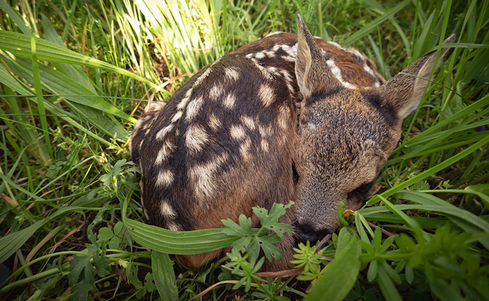 Der Einsatz von Drohnen bietet die Möglichkeit, zeitsparend und effektiv Grünland- und Ackerfutterflächen insbesondere nach Rehkitzen abzusuchen und diese vor Verletzungen oder dem sogenannten Mähtod zu bewahren. Vegetations- und witterungsbedingt bleibt den Landwirtinnen und Landwirten nur ein kleines Zeitfenster, um ihre Flächen zu mähen. Hierbei sind Wildtiere in dichten Grasbeständen aber meist mit bloßem Auge nicht zu erkennen. Betroffen sind vor allem Rehkitze, da in ihren ersten Lebenswochen die erste Mähperiode des Grünlands ansteht. Rehkitze werden von ihren Müttern häufig in den dichten Beständen auf landwirtschaftlichen Flächen versteckt, weil sie im hohen Gras gut vor Räubern geschützt sind. Anstatt zu fliehen, verharren Kitze jedoch reglos auf dem Boden, wenn ihnen Gefahr droht. Schätzungen zufolge werden dadurch jedes Jahr tausende Rehkitze bei der Mahd verletzt oder sogar getötet.