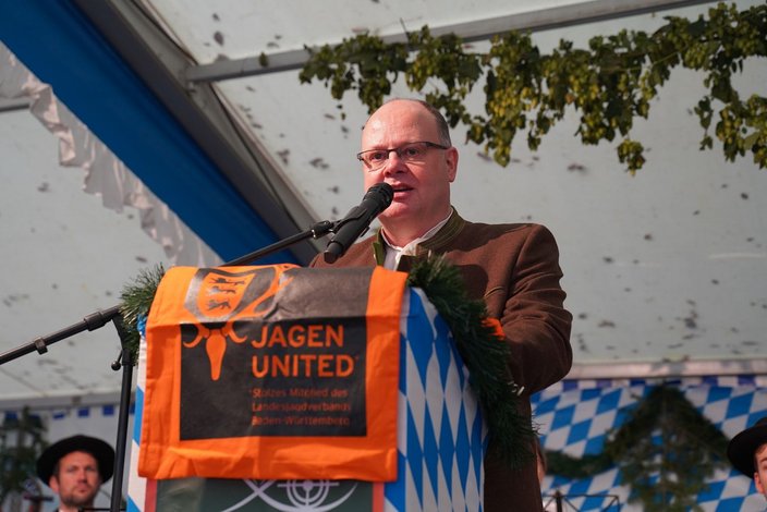 Im Anschluss an den Wirtschaftsminister nahm DJV-Präsident Dr. Volker Böhning das Wort auf. Rund sieben Stunden Fahrt hat er auf sich genommen, um die Messe Grünau zu besuchen. Besonders lag ihm am Herzen, dass es höchste Zeit werde, dass der Bayerische Jagdverband wieder unter den Dachverband DJV kommt. Der stellvertretende Landesjägermeister erläuterte anschließend weshalb der LJV BW auf einer Messe in Bayern auftritt: „Wir teilen über 800 km Landesgrenze, gemeinsame Werte und Traditionen, beide Bundesländer besetzen in Deutschland wirtschaftliche Spitzenplätze und haben viele engagierte Jägerinnen und Jäger.“