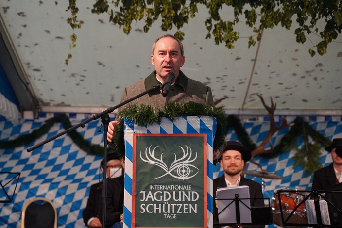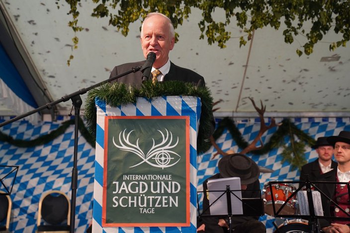 Musikalisch begleitet von Jagdhörnen, Alphörnern und Schüssen liefen die Veranstalter, Familie Reich, der bayerische Wirtschaftsminister und stellvertretender bayerischer Ministerpräsident, Hubert Aiwanger, der Präsident des Deutschen Jagdverbandes, Dr. Volker Böhning und der stellvertretende Landesjägermeister, Claus G. Kissel, durch den Torbogen der Schlosses. Minister Aiwanger freut sich in seinem Grußwort über die Anwesenheit des Landesjagdverbandes auf den Jagd- und Schützentagen. Besonders betonte er, dass es nicht sein kann, dass legale Waffenbesitzer schikaniert werden, nur weil „ein Extremist oder Geistesgestörter Waffen missbraucht“. Denn, wenn dies der Fall ist, sei in der Regel der erste Reflex, das Waffengesetz zu verschärfen. „Lasst die staatstreuen Leute in Ruhe, von denen geht keine Gefahr aus!“, so seine doch teilweise provokanten Worte. Im Abschluss appellierte er an alle anwesenden Jäger „Jeder von uns muss draußen in der Öffentlichkeit positiv über die Jagd berichten."