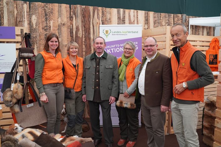 Der Stand des Landesjagdverbandes Baden-Württemberg erscheint auf der Messe in Grünau in neuem Glanz. „JAGEN UNITED“ unter diesem plakativen und vielleicht provokanten Slogan trat der LJV in Orange auf. Mit dem Konzept des Zeitstrahls kann sich jeder Jäger auf dem Stand wiederfinden. Wohl weniger in der grauen Vorzeit von Lascaux, aber sicher im grünen Handwerk der Jagd, die orangene Gegenwart für den funktionellen und modernen Jäger. Die Herausforderung der Zukunft der Gesellschaft und damit auch der Jagd ist in Lila dargestellt. Viele Mitglieder des LJVs bestaunten den neuen und modernen Stand. Es wurden interessante Gespräche geführt, Informationen gestreut, Mitglieder geworben und Produkte der Fellwechsel sowie JagdService verkauft.