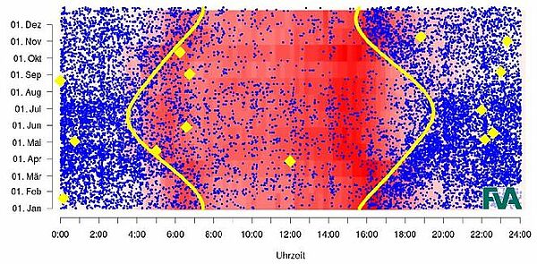 Die Abbildung zeigt Straßenüberquerungen von 32 mit GPS-Halsbandsendern ausgestatteten Rehe im Tages- und Jahresverlauf (blaue Punkte; N = 13.689). Die gelben Linien zeigen Sonnenauf- und Sonnenuntergang im Jahresverlauf. In Rot hinterlegt ist das durchschnittliche Fahrzeugaufkommen pro 15 Minuten (dunkelrot 200 Fahrzeuge/15min). Gelbe Rauten stellen die nachweislich durch Verkehr getöteten GPS-besenderten Rehe dar (Grafik: FVA).
