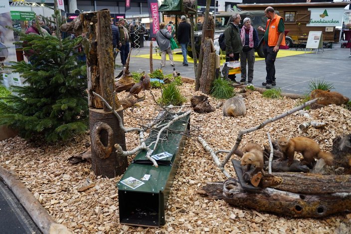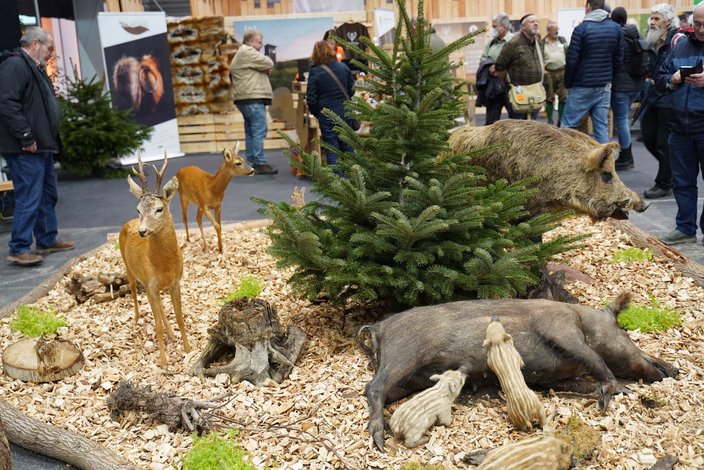 Das Diorama, war geschickt in den Messestand eingebunden. Im Niederwilddiorama präsentierten die Stadtjäger ihre Fallen, um auf die Wichtigkeit der Prädatorenbejagung und -prävention hinzuweisen. Außerdem gab es regelmäßige Jagdgebrauchshundepräsentationen, Wissenswertes rund um das TCRH - Trainings Center Retten und Helfen, Wildbret und Veränderungen als Herausforderung für die Jagd auf der Bühne. Abgerundet wurde die Messe mit einem Highlight der Extraklasse: Am Sonntag, den 2. April, gab es ein erneutes landesweites Jagdhornbläsertreffen in der Orthenauhalle der Messe.