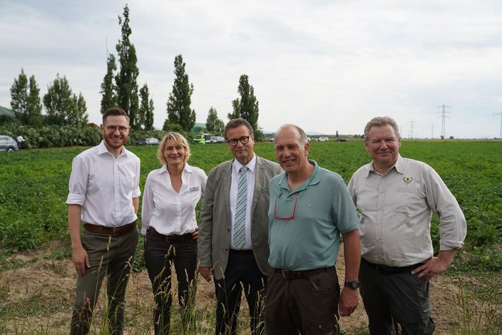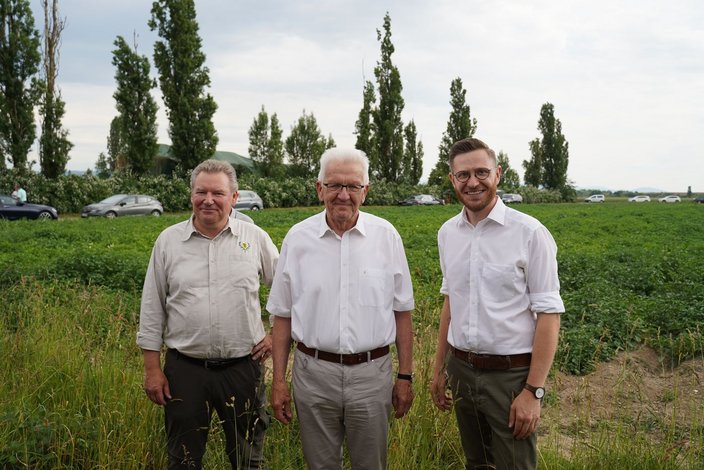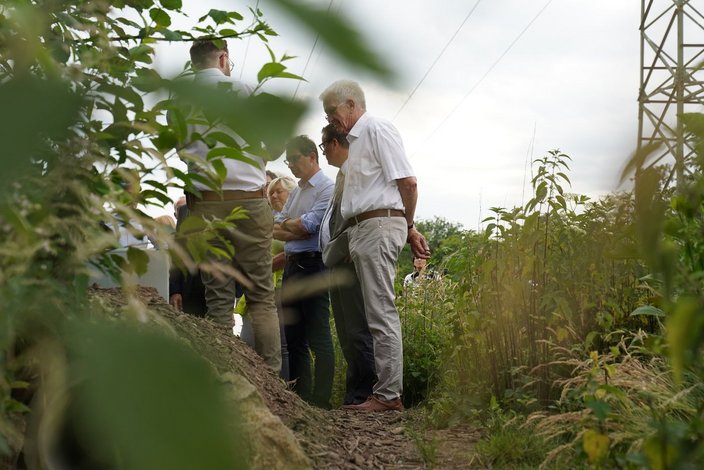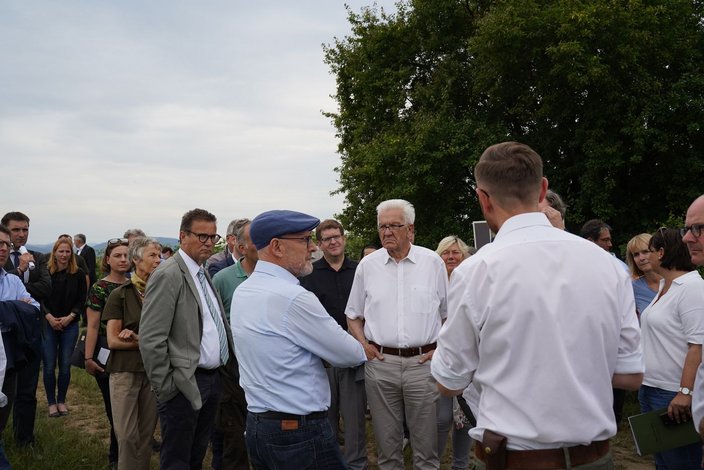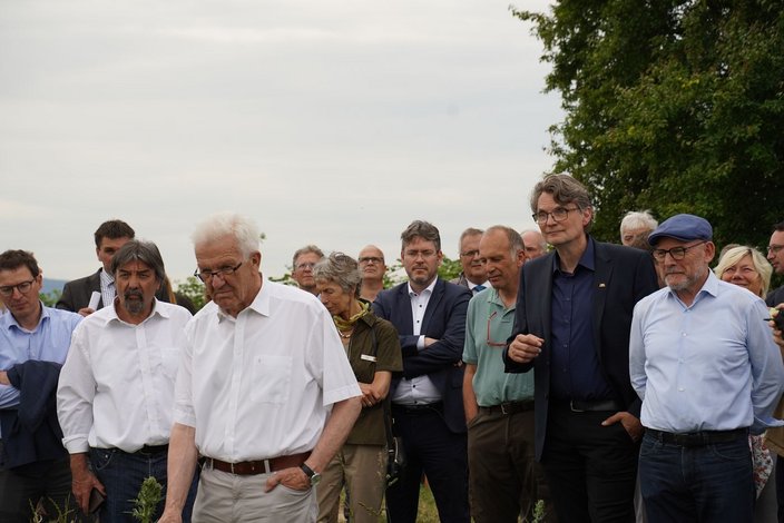 Im Rahmen einer größeren Exkursion in der Rheinebene zum Sonderprogramm Biologische Vielfalt der Landesregierung besuchen Ministerpräsident Kretschmann, Ministerin Walker, Minister Hauk und Minister Hermann verschiedene Projekte, die aus dem Sonderprogramm finanziert werden. Dargestellt wurde, was „in der Fläche“ ankommt und welche nachhaltigen Verbesserungen für die Biodiversität damit verbunden sind.
