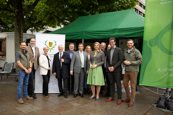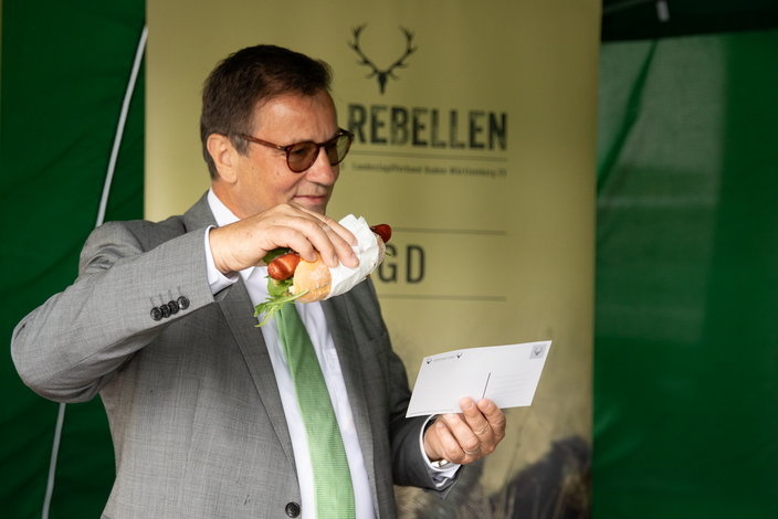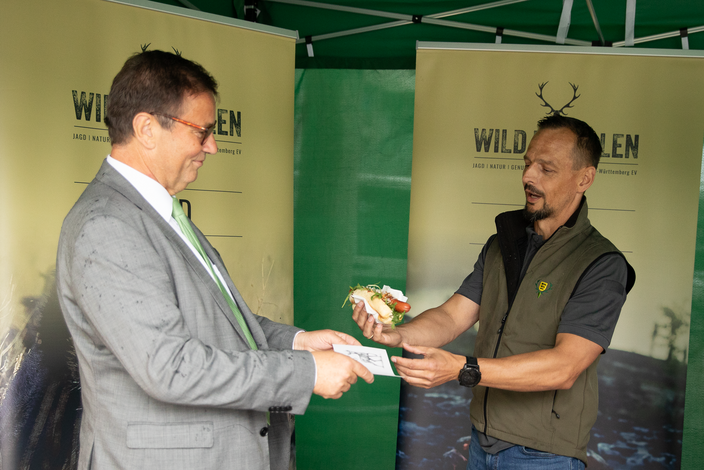 Vertreter des Landtags, des Ministeriums für Ernährung, Ländlichen Raum und Verbraucherschutz (MLR) und des Ministeriums für Umwelt, Klima und Energiewirtschaft (UM) haben sich in der Mittagspause von den Vorzügen des Wildbrets überzeugen lassen und konnten sich dabei über Jagd, Natur und Genuss informieren. „Wild ist das biologischste aller fleischlichen Lebensmittel“, betonte Peter Hauk, Minister für Ernährung, Ländlichen Raum und Verbraucherschutz, und sagte: „Wir haben natürlich das Interesse, dass Jäger das hochwertige Fleisch auch hochwertig vermarkten können.“ Im Rahmen der Aktion stellte das MLR die App „Von Daheim BW“ vor, in der seit dem 15. Mai 2024 nun auch Jägerinnen und Jäger mit eigener Vermarktung zu finden sind.