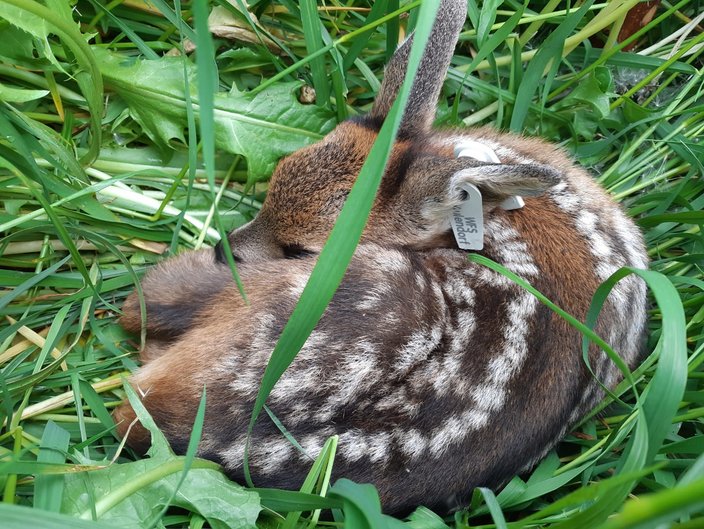 In der nächsten Zeit beginnt wieder die Mahd von Wiesen. Nehmen Sie Ihre Verantwortung für das Wild wahr und versuchen Sie die Mähverluste zu verringern. Es gibt hierzu viele Möglichkeiten. Das Wichtigste ist eine gute Kommunikation mit dem Landwirt, damit bekannt ist, wann welche Fläche gemäht werden soll. Am Vortag der Mahd können Scheuchen aufgestellt werden (akustisch, optisch (z. B. Blinklichter) oder geruchlich durch verstänkern). Vor der Mahd können die Flächen abgesucht werden. Unabhängig davon, ob die Suche mit Wärmebildkamera und Drohne erfolgt oder mit Personen die die Flächen ablaufen, bietet sich hierbei die Gelegenheit, gefundene Kitze und Jungtiere aus der Fläche zu entfernen und die Kitze zu markieren. Falls Sie hierfür keine Zeit gehabt haben, versuchen Sie, dass der Landwirt von innen nach außen oder auf den Waldrand hin mäht und akustische oder mechanische Wildretter verwendet.