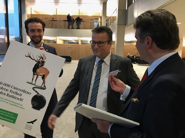 Der LJV war bei der Übergabe mit dabei. Er verfolgt mit seiner „PLATZ-Hirsch“ – Kampagne ein gemeinsames Ziel mit der Deutschen Wildtier Stiftung. „Wir fordern einen artgerechten Umgang mit unseren größten heimischen Säugetierart, basierend auf wildbiologischen Erkenntnissen“, so Dr. Erhard Jauch vom LJV beim Termin im Landtag, „die über 60 Jahre alte Rotwildverordnung ist dafür keine geeignete Basis mehr“.
