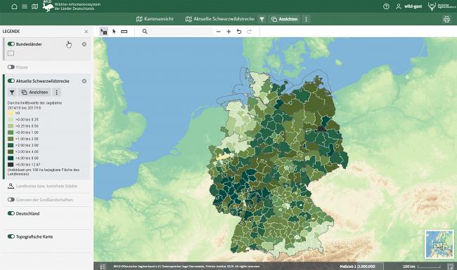 Ab sofort bietet der Deutsche Jagdverband (DJV) digitale Jagdstatistiken von 1996/97 bis 2018/19 im WILD-Portal an. Auf der Internetseite www.wild-monitoring.de können Nutzer auf bundesweite Auswertungen aus dem Wildtier-Informationssystem der Länder Deutschlands (WILD) zugreifen. Aktuelle Jagdstatistiken und Trends für verschiedene Arten lassen sich in Form von Karten, Diagrammen und Tabellen darstellen. Die digitalen Daten orientieren sich am kürzlich veröffentlichten WILD-Jahresbericht 2018. Im Fokus stehen Schalenwildarten wie Reh-, Rot- und Schwarzwild sowie invasive Arten, wie Waschbär, Nutria und Nilgans.
