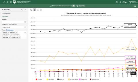 Nutzer können die Ergebnisse über Filter individuell zusammenstellen. Zudem gibt es die Möglichkeit, Grafiken herunterzuladen - beispielsweise für Präsentationen oder weiterführende Fragestellungen. Insgesamt lassen sich im Portal Informationen zu Vorkommen, Besatzdichte und -entwicklung sowie Jagdstatistik von 20 Tierarten recherchieren.