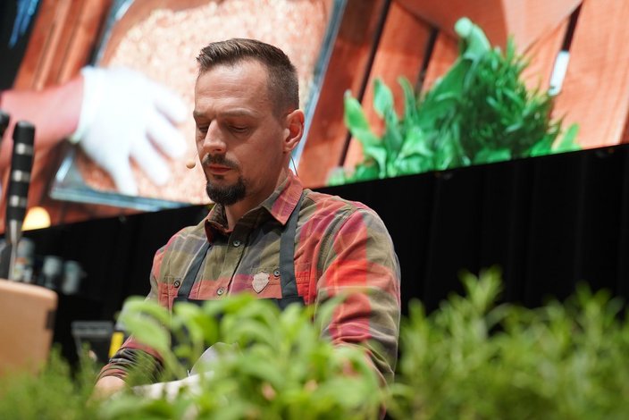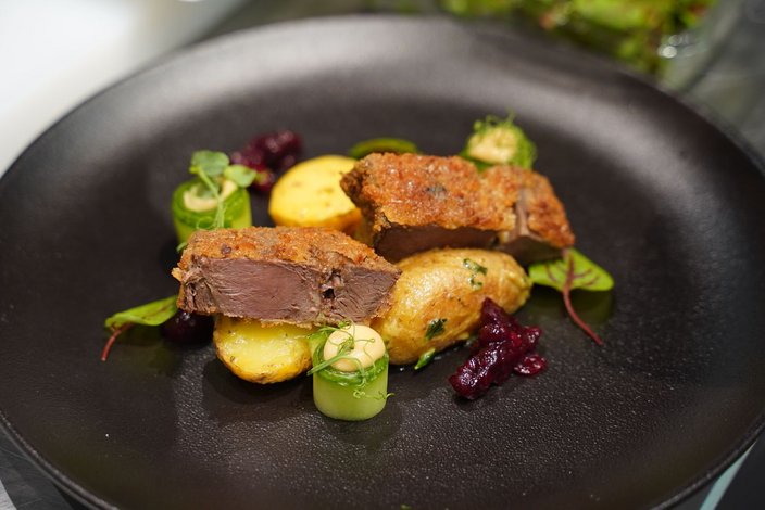 Jonas Baumgärtner von Wild Cooking zauberte paniertes Elchherz, das mit großem Interesse gekostet wurde. Samuel Golter betonte: „Es ist wichtig in der nichtjagenden Bevölkerung Wildbret anzupreisen, aber es ist noch wichtiger, den Jägern immer wieder zu zeigen, welch wertvolles Lebensmittel wir produzieren. Es schmecken nicht nur Rücken und Keule, sondern auch Innereien können hervorragend verarbeitet und angerichtet werden.“ Applaus unterstrich seine Aussage und die hervorragende Arbeit der Wildrebellen.