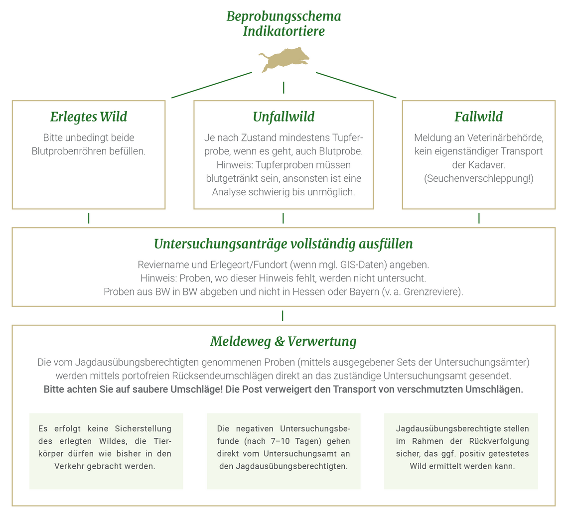 Das Thema Beprobung von Fall- und Unfallwild bekommt nun eine ganz neue Wichtigkeit. Nach Absprache mit dem MLR sind Jäger des Landes angehalten, alles Unfallwild (Schwarzwild) zu beproben und Kadaver bei den zuständigen Veterinärämtern der Landkreise zu melden. Proben-Sets sind auf Anfrage bei der zuständigen Veterinärbehörde erhältlich.