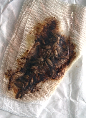 Die anschließende Bronchoskopie in Vollnarkose bringt die schlechte Nachricht: Artus hat eine Getreideähre in der Lunge! Die hat sich in den letzten neun Monaten immer weiter nach hinten gearbeitet und eine massive Entzündung mit eitrigem Lungenabszess verursacht. Der Versuch, die Ähre mit einer Zange zu entfernen schlägt fehl, aber immerhin kann der Abszess eröffnet werden. Artus bekommt wieder Antibiotika und nachdem ein Spezialaufsatz für das Endoskop bestellt wurde, folgt nach drei Wochen erneut eine Bronchoskopie. Für die Besitzer sind es bange Stunden, denn wenn es wieder nicht gelingt, die Ähre auf diesem Weg zu entfernen, droht Artus eine Lungenoperation mit Eröffnung des Brustkorbs. Nach zwei Stunden ist es aber zum Glück geschafft – der Tierarzt kann erleichtert Artus´ Besitzern die Ähre zeigen, die er als Ganzes mit dem Endoskop durch die Luftröhre entfernen konnte! Von nun an geht es Artus täglich besser – er frisst wieder gut, sprüht vor Lebensfreude, kann seinen Besitzer beim Jagen begleiten und vor allem ER HUSTET NICHT MEHR!!!