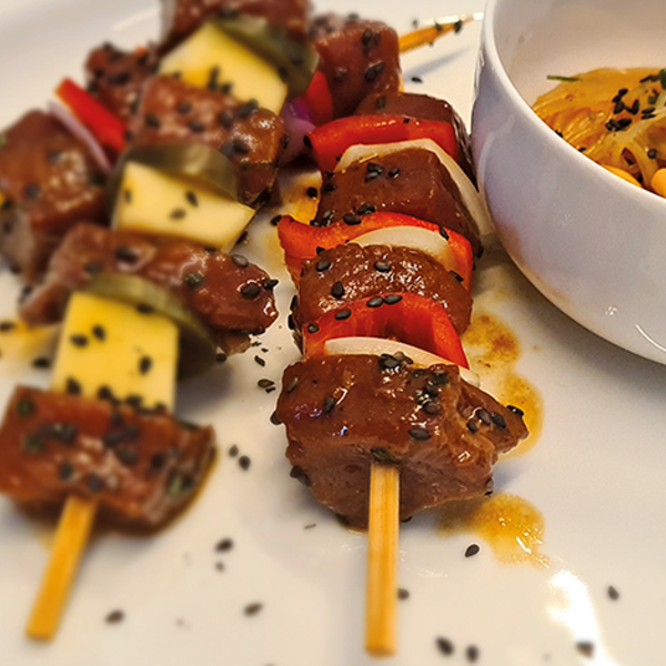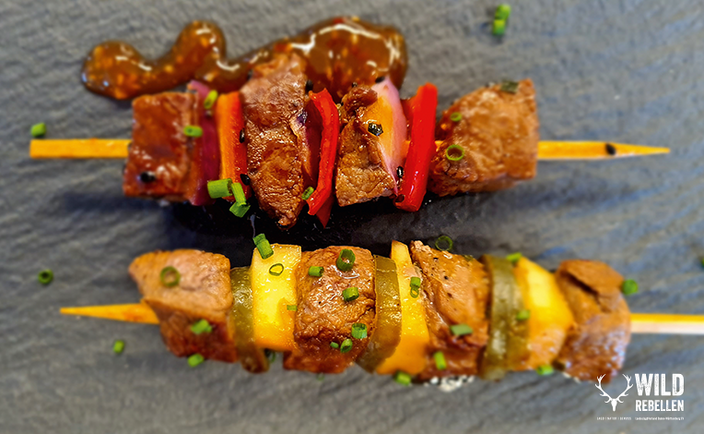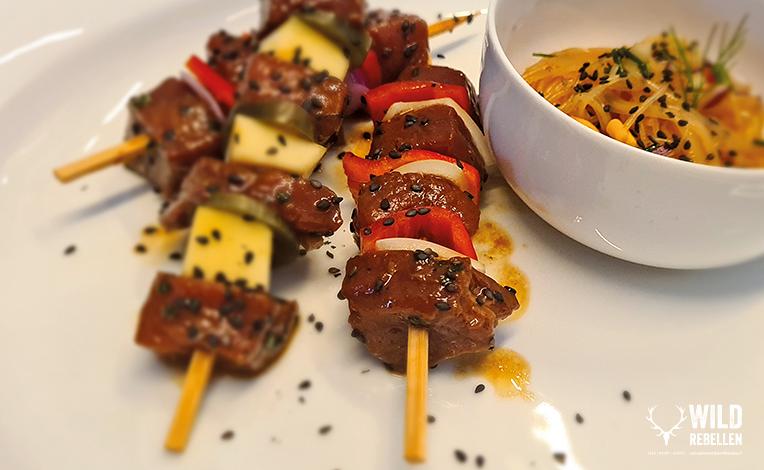 Man kann nicht jeden Tag Filet oder Rücken essen! Zum Glück bietet auch die Keule, hier vom Schwarzwild, das eine oder andere feine Stück zum Kurzbraten oder Grillen. Mit der richtigen Marinade und fruchtig-gemüsigem Beiwerk auf ein Spießchen drapiert, serviert an einem leichten aber würzigen Asiasalat, locken wir nun auch den letzten Wild-Grillmuffel hinterm Thermomix vor!