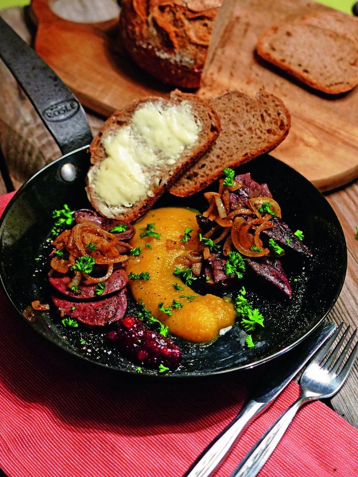 - Herz und Leber salzen und pfeffern, auf Apfelmus anrichten und mit den Zwiebeln, Preiselbeeren und gehackter Petersilie anrichten.