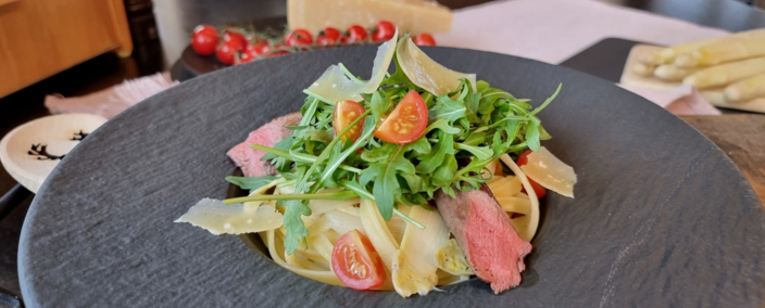 Habt ihr schon einmal Spargel der Länge nach geschnitten und ihn dann auf eine Gabel aufgedreht? Nicht? Das müsst ihr unbedingt probieren! Die Textur mit den Tagliatellen ist fantastisch! Und dazu das allerbeste Fleisch– Rehfilet! Für mich die absolute Wildbret Perle!