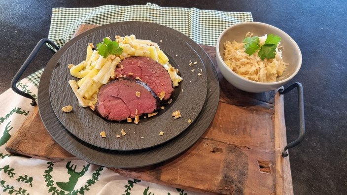 2 h vor dem Essen Backofen auf 110 °C vorheizen. Das Fleisch mit den Händen grob abreiben. In der Pfanne mit z. B. Butterschmalz rundherum gut anbraten.