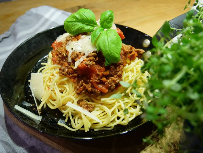 - Spaghetti al dente kochen und mit Parmesan und Basilikum anrichten.