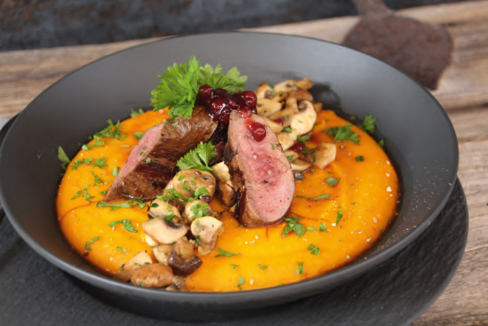 - Die Suppe bildet den Untergrund, darüber werden die Champignons mitten auf dem Suppenteller angerichtet, das Wildschweinfilet aufgeschnitten udn auf dem Bettt aus Champignons drapiert.